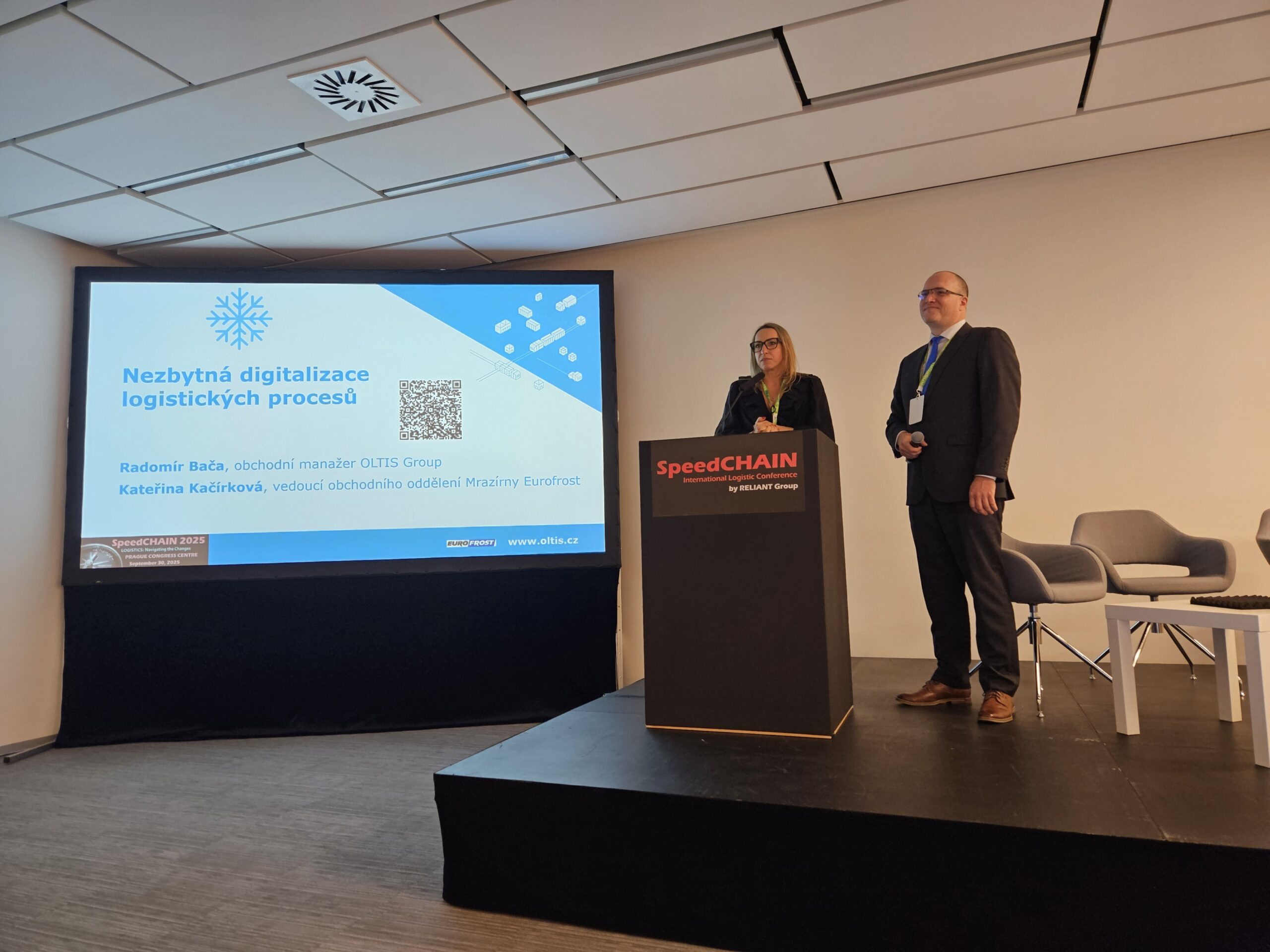 OLTIS Group is a traditional participant of the conference and was present this year as well, both with its own exhibition and with a professional presentation. Radomír Bača (Sales) together with Kateřina Kačírková from EUROFROST and FROSTTRANS gave a presentation on the interesting topic of “The Necessary Digitisation of Logistics Processes,” which was received very positively. They focused on specific practical examples of how digitisation helps to streamline operations, increase transparency, and better respond to the challenges of today’s market.